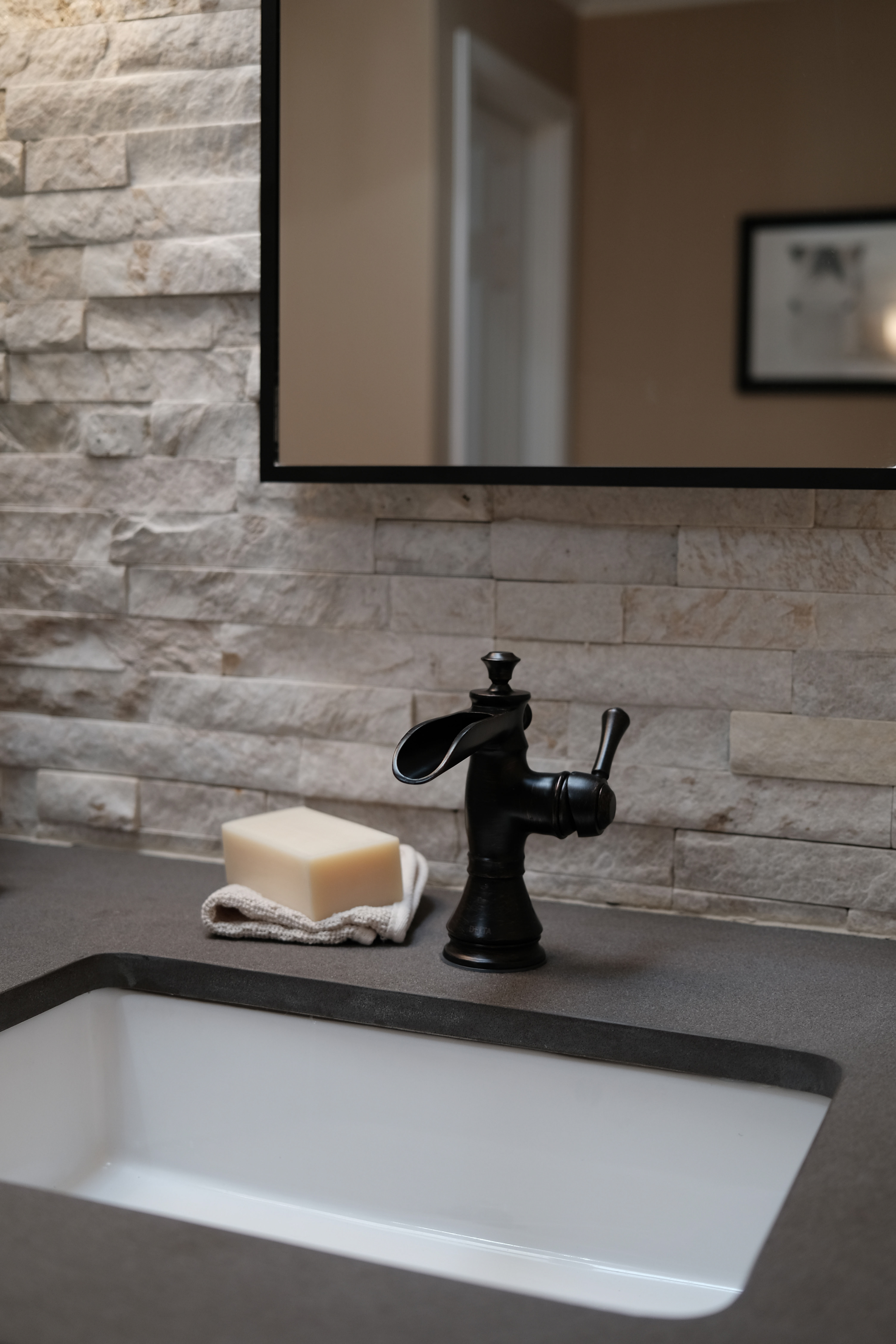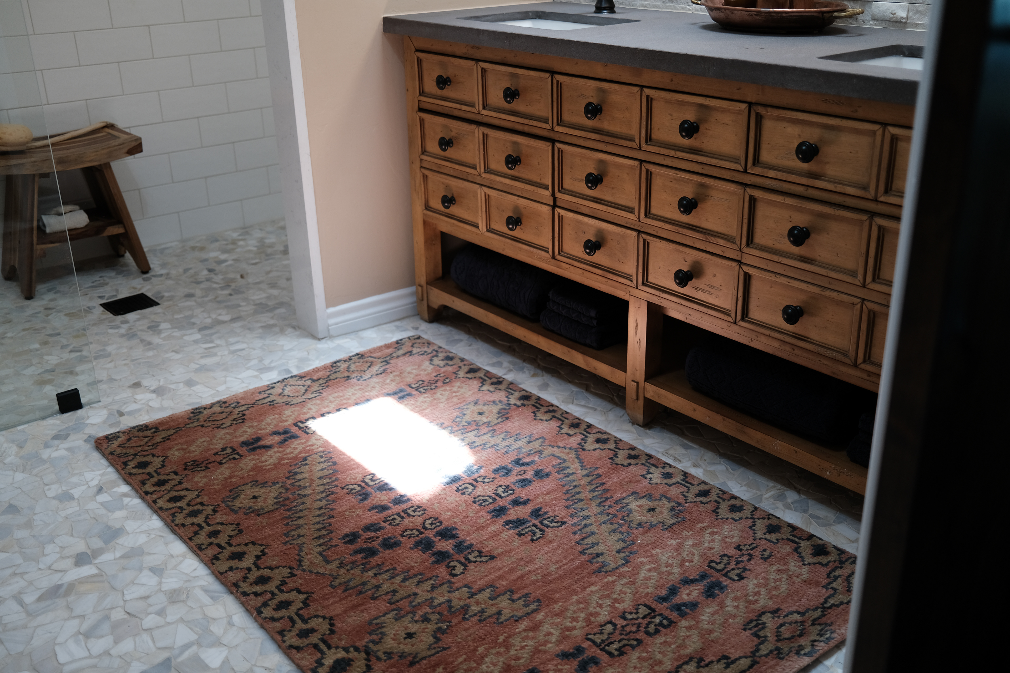 This project was born from a dream with a need for functionality. I consulted over several months for a complete remodel of this primary bath. The existing bathroom was completely gutted to make space for a larger shower and water closet. The vanity was relocated to the opposite side of the bathroom, utilizing the existing skylight to provide natural light. The client needed a space that would allow for aging in place and accessibility. The aesthetic was heavily inspired by the show Yellowstone, embracing an expensive ranch style. Every selection, from the his-and-hers medicine cabinets to the teak shower bench, was carefully curated and something the client truly loved. The vanity, inspired by a 19th-century apothecary cabinet found on an antique shopping trip, was an especially exciting piece that set the tone for the remaining selections.